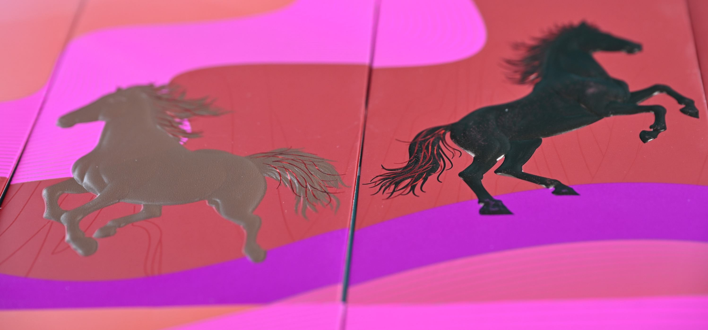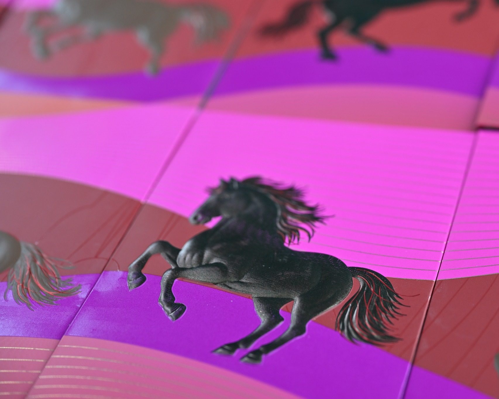 Мощный силуэт лошади привлекает внимание своим преломлением, создает зеркальную поверхность, которая меняется и переливается при движении. Эта утонченная игра света подчеркивает мускулистые контуры и динамичную позу вздыбленной лошади, олицетворяя силу, скорость и порыв вперед. Яркий акцент малиновой фольги подчеркивает развевающуюся гриву и хвост, добавляя драматический эффект благоприятного красного цвета, который символизирует страсть, жизненную силу и удачу. каждая деталь вызывает восхищение.