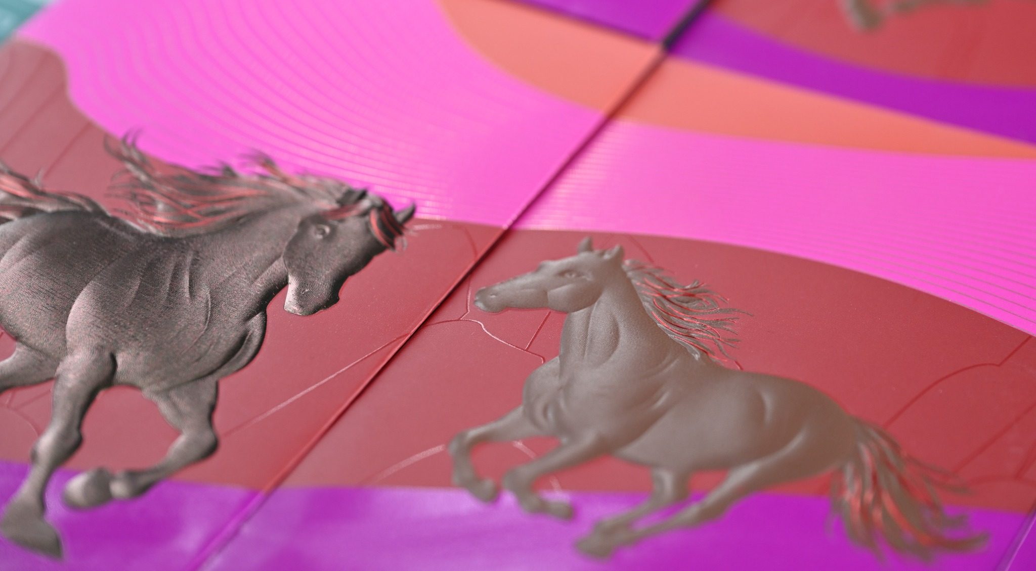 Этот изысканный красный конверт, созданный для того, чтобы передать необузданный дух лошади, мастерски и мастерски отмечает Год Лошади. Величественный конь прыгает с поверхности благодаря инновационному слиянию тисненой и тисненой текстуры — объемной технике, которая оживляет каждое сухожилие и развевающуюся гриву, создавая тактильные ощущения, которые действительно «скачут по бумаге».